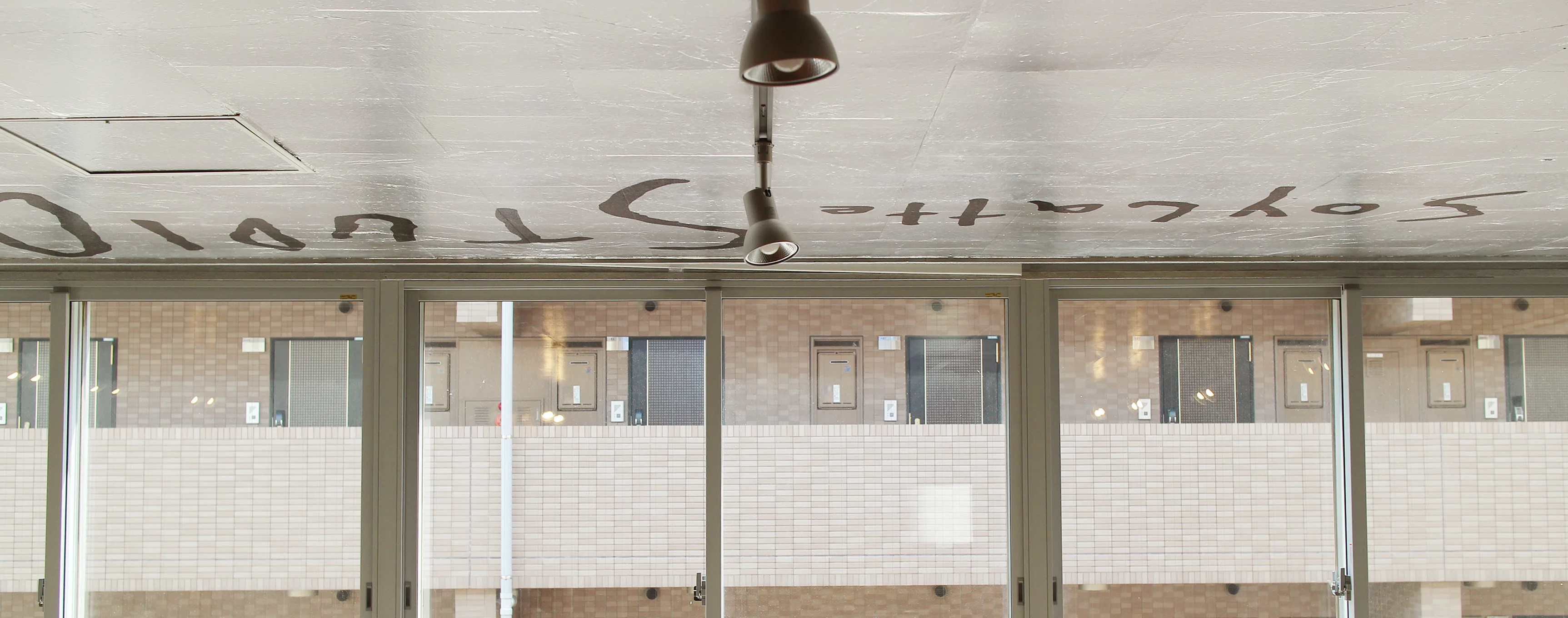 対照的に天井は、一面金属的なシルバーで覆われています。
